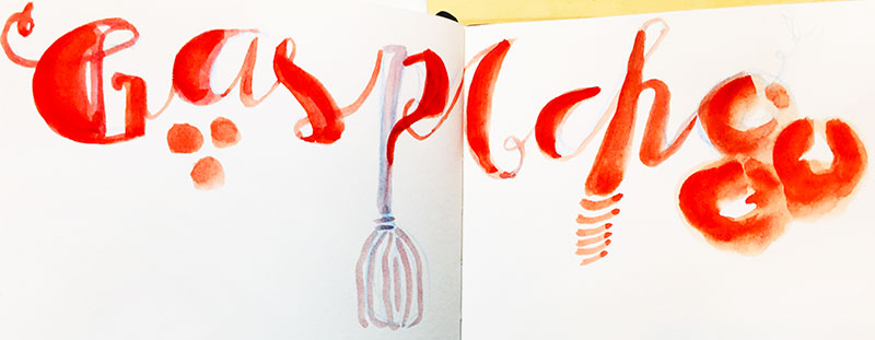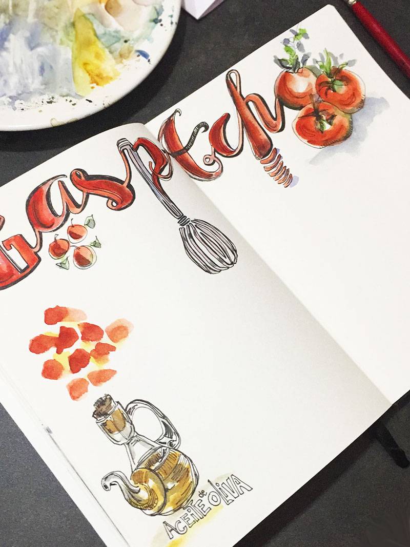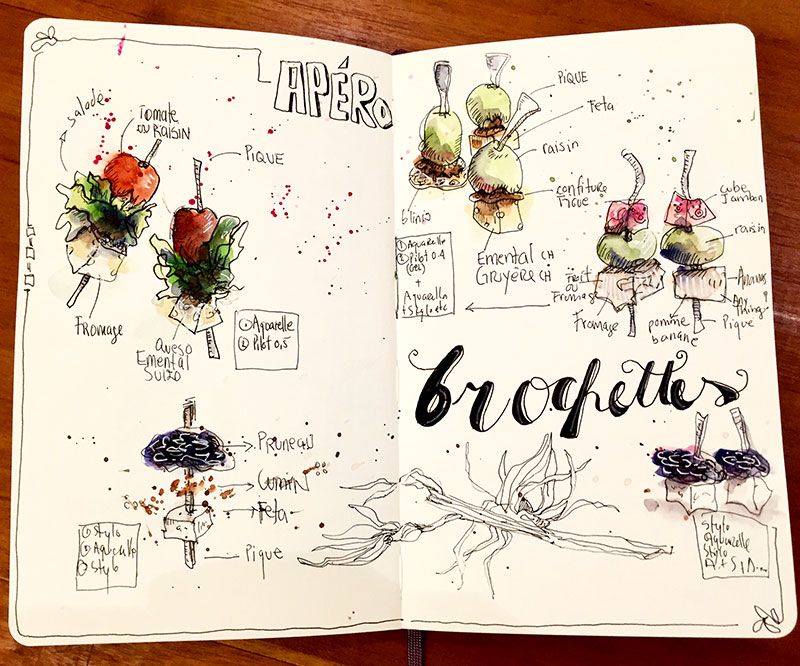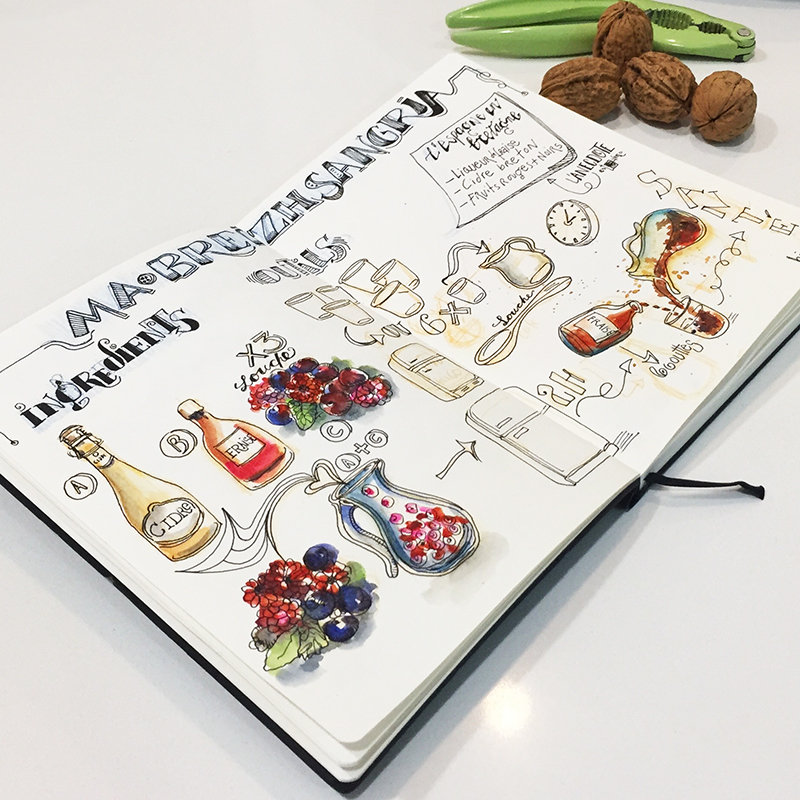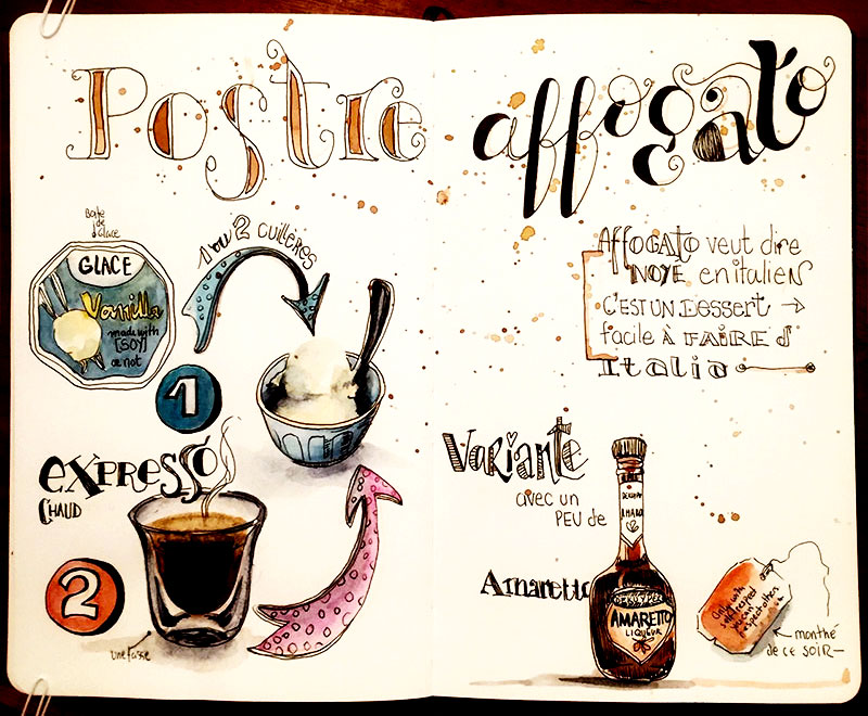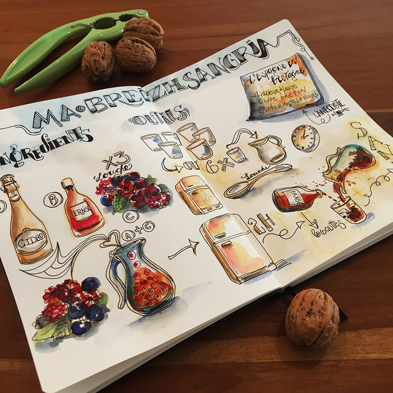 Illustration de la recette choisie – Pour ce dessin j’ai tracé d’abord ce que je voulais illustrer avec des crayons aquarellables orange et bleu pour les titres, puis j’ai retracé le tout avec le stylo Pilot 0.5 noir. D’habitude je dessine directement avec le stylo sans le pré-traçage, ceci n’est qu’une autre façon de faire.