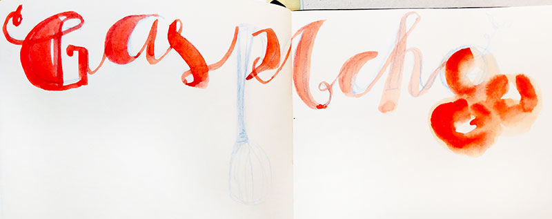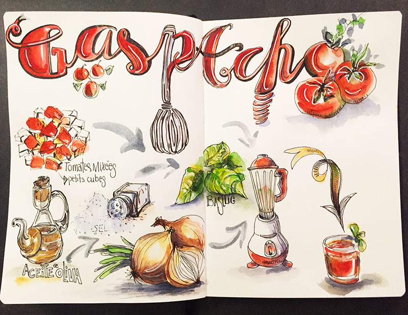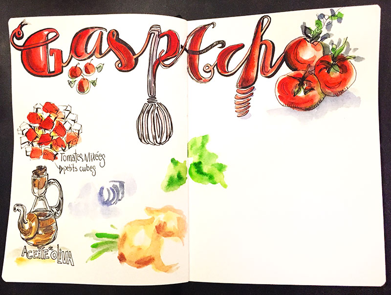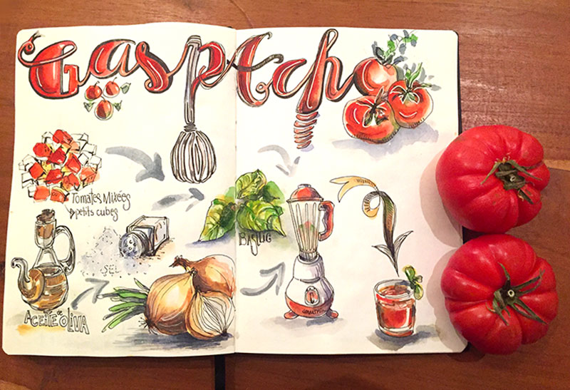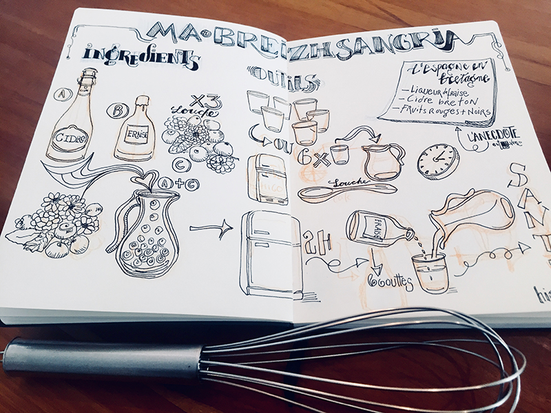 B- Faites un croquis rapide avec un crayon de couleur aquarellable ou un Bic pour préciser un peu où vous allez mettre les ingrédients, le matériel et des pas à pas ou des étapes de ce que vous souhaitez dessiner.