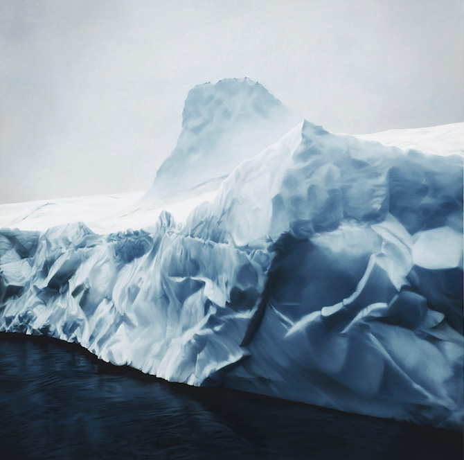 Mon procédé commence par des voyages dans ces lieux se trouvant au premier plan de ces changements climatiques, sur place je prends des milliers de photos. De retour au studio je travaille à la fois en utilisant mes souvenirs de ces expériences et les photos que j´ai prises pour créer des compositions à grande échelle, quelque chose de plus de 3 mètres de large.